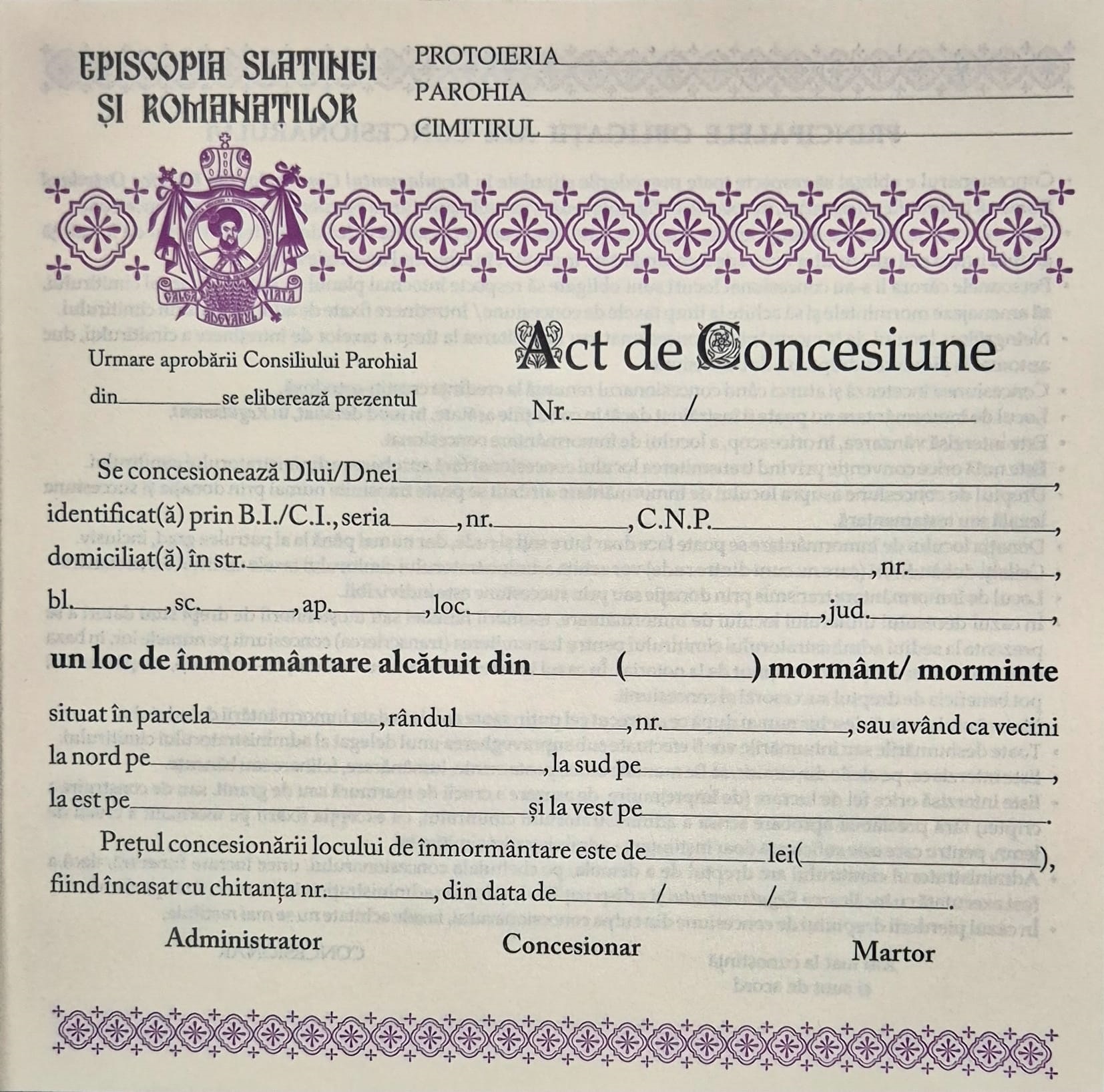 Ca urmare a „Regulamentului privind organizarea si functionarea cimitirelor aflate sub autoritate Consiliului Parohial al Parohiei gropsani, locurile de înhumare din cimitirele aflate în administrarea Consiliului Parohial al Parohiei Gropsani, sunt atribuite în concesiune, la cerere, în condiţiile legislaţiei aflate în vigoare şi al prezentului Regulament, prin eliberarea unui Act de Concesiune.